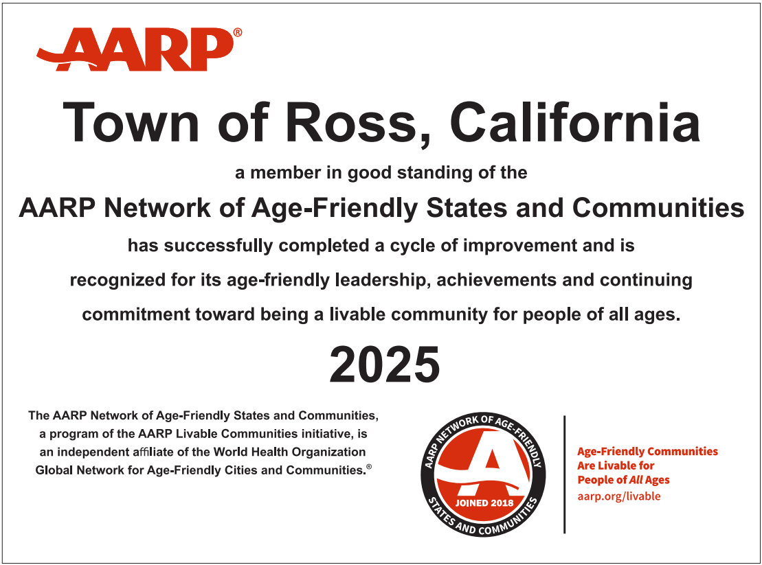 In 2018, the Town of Ross applied to become an Age Friendly community and was awarded the designation as Age Friendly in November 2018. The Age Friendly Ross Award designation was presented to the Town Council of Ross by an AARP representative at the October 2019 Council Meeting.